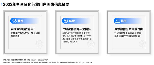 巨量算数&算数电商研究院也洞察到了抖音日化行业用户大盘的变化。较2022上半年,年末女性主导地位更稳固,年轻化特征有一定提升,城市等级整体分布日益均衡。