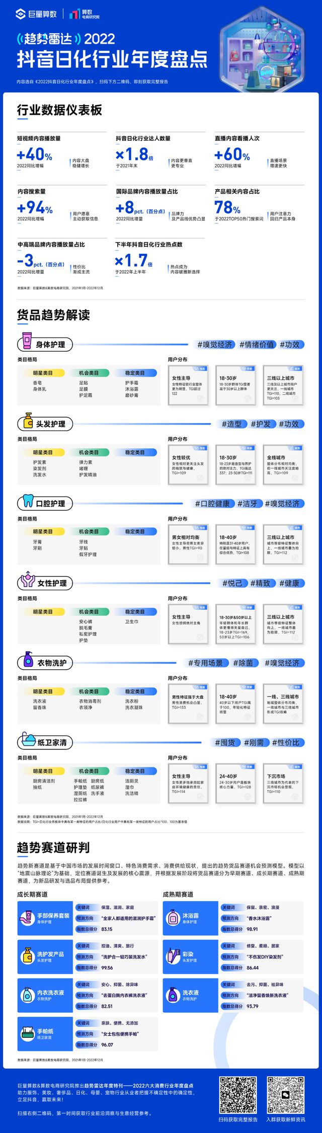 【日化】中国市场短期内仍将是全球日化行业稳定的增长阵地发表时间:2023-02-10 11:15 (快消品讯)近日,巨量数算发布《趋势雷达-2022抖音日化行业年度盘点》,分别从行业整体数据、细分货品趋势、行业风向几个方面进行解读。