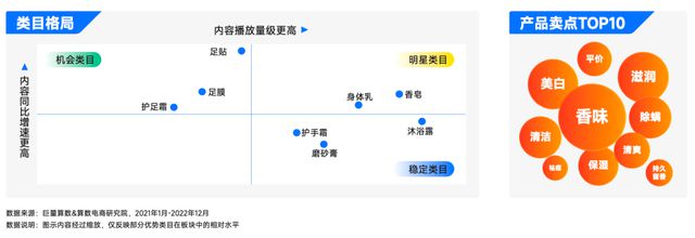 身体护理、头发护理、口腔护理、女性护理、衣物洗护、纸卫家清六大板块解读 一、身体护理:产品类目满足悦己需求,情绪价值成为关注重点 日化行业的“悦己经济”与“嗅觉经济”同时作用于需求侧,与二者相关联的短视频内容播放量级更高。消费者更加关注产品带来的情绪价值,“香味”“美白”“滋润”等卖点成为TOP关键词,利好沐浴露、香皂、身体乳等类目。