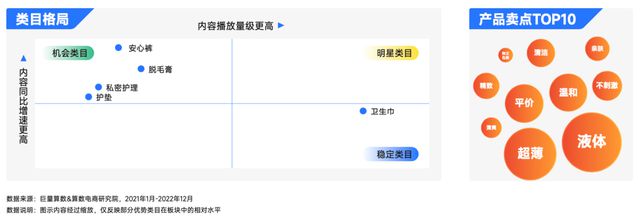 四、女性护理:卫生巾依旧稳定发力,消费者更注重材质信息 在女性护理类目上,卫生巾表现稳定,安心裤等细分场景替代品类机会明显。同时,用户对材质信息的关注度有大幅提升,产品卖点中“液体”“温和”“不刺激”等占据TOP榜单,市场教育已现成效。